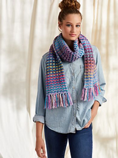 Chamarel is a scarf featuring a kaleidoscope of stunning colors, inspired by the Seven Colored Earths. By combining three gradient shades of Creative Melange Chunky in a slip stitch pattern, the result is just as wondrous as its namesake location. This artful accessory is sure to make a statement on the dreary, cold days of winter!