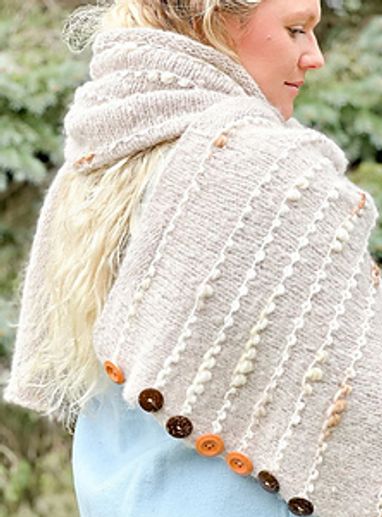 Perla is a super soft, fuzzy, warm, cozy and fun wrap to knit and to snuggle up in. Living in Minnesota as I do, I’m always in search of an accessory that isn’t just functional. So, I designed Perla with pure comfort and relaxation in mind, with the added benefit of warmth. The yarns, while a bulky weight, feel surprisingly light and yet warm. I added accent rows of little buds for a bit of whimsy (and who doesn’t need that when the weather turns cold?), along with optional buttons on each end of the wrap because, well, buttons! Wearing Perla might just be the thing to finding your happy place.