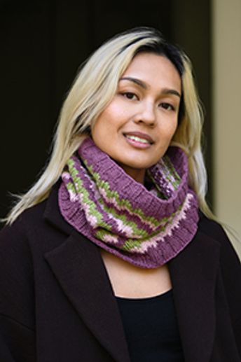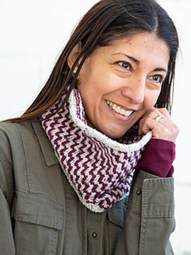 Worked in the round, the Zig Your Zag Cowl utilizes two contrasting colors to create visual interest and movement, while the slip stitches that shift placement every two rows adds loads of texture.